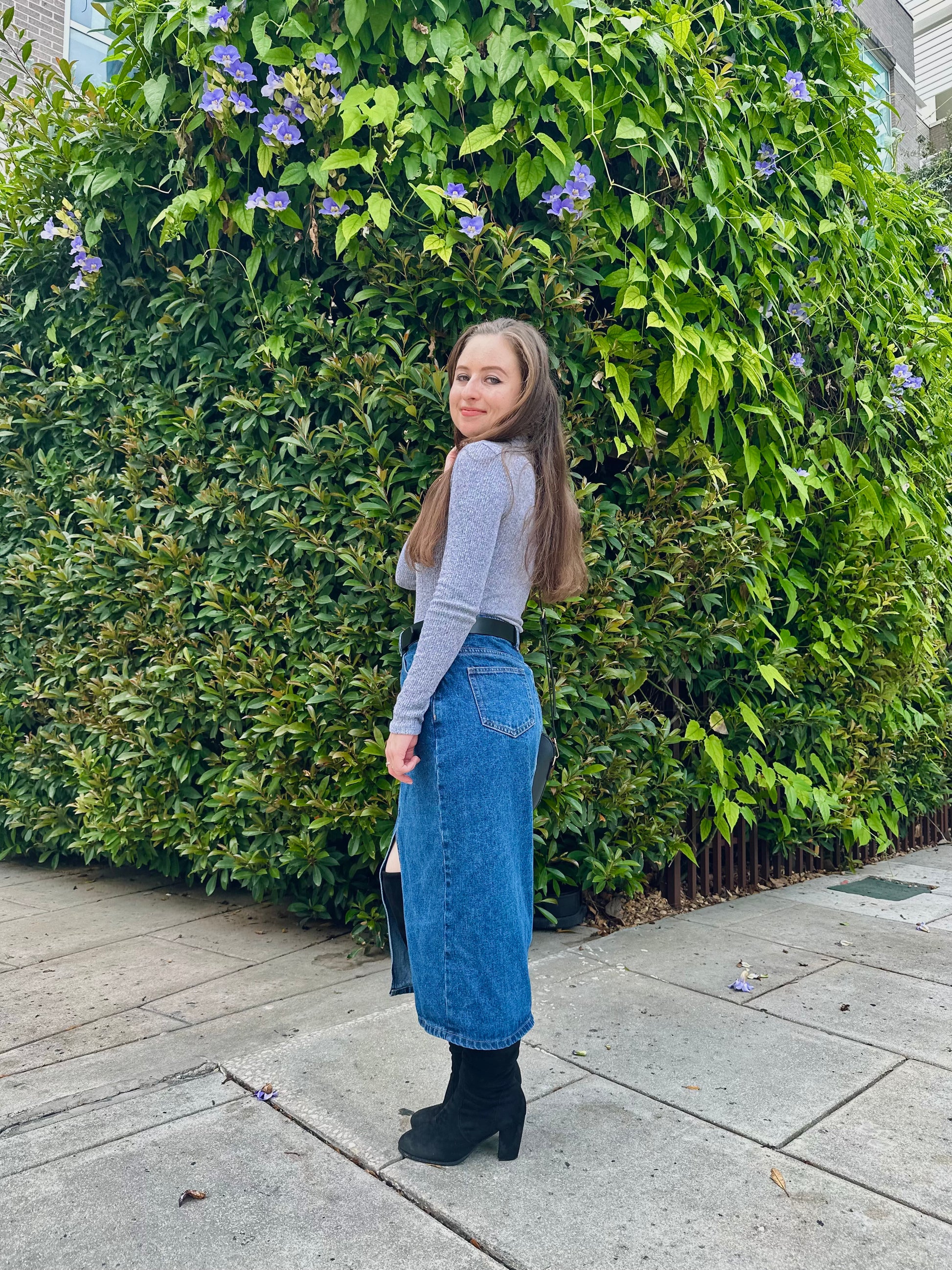 - Classic, trendy, fashionable, comfortable, high quality petite denim midi skirt with button and zipper closure
