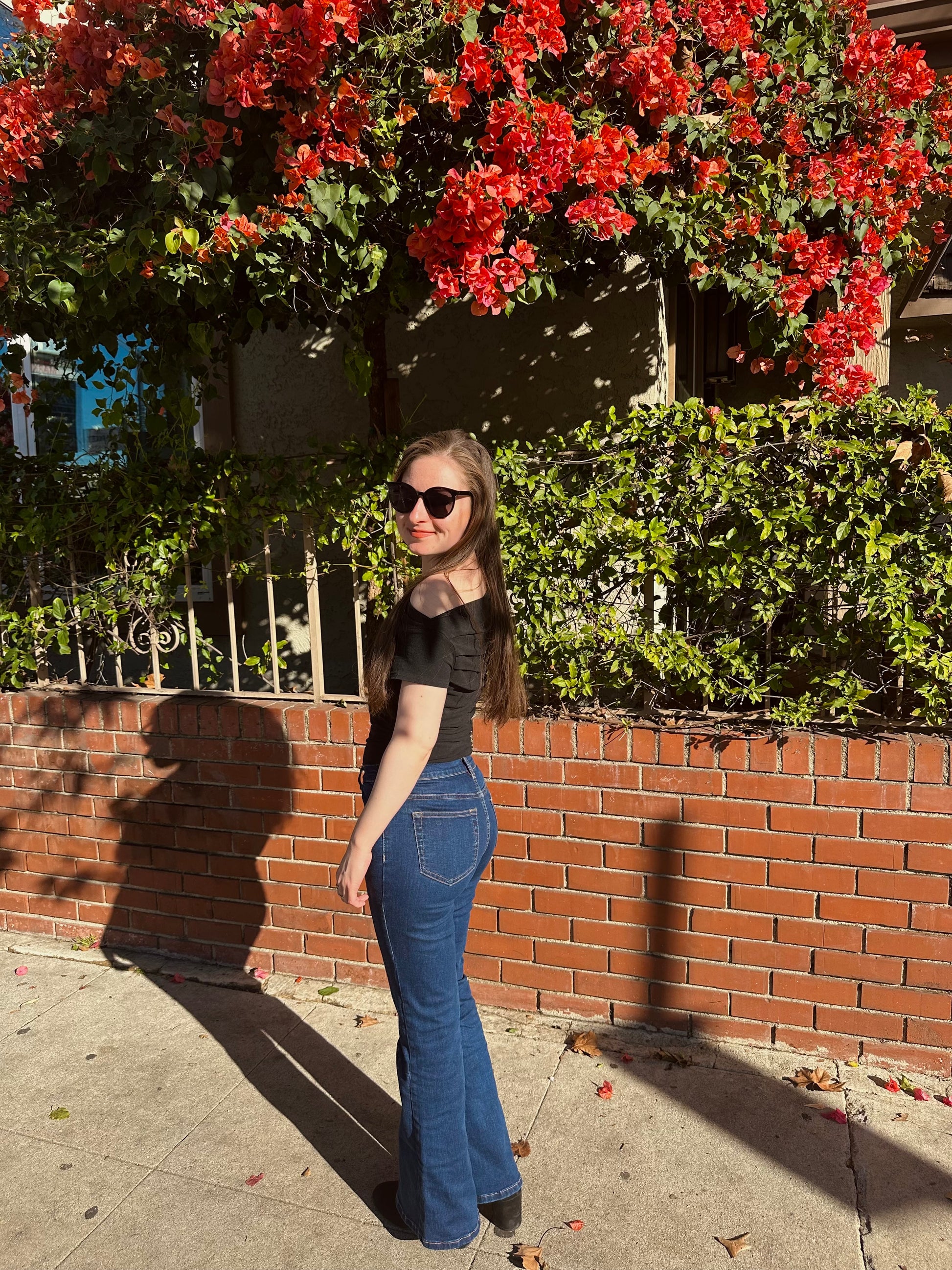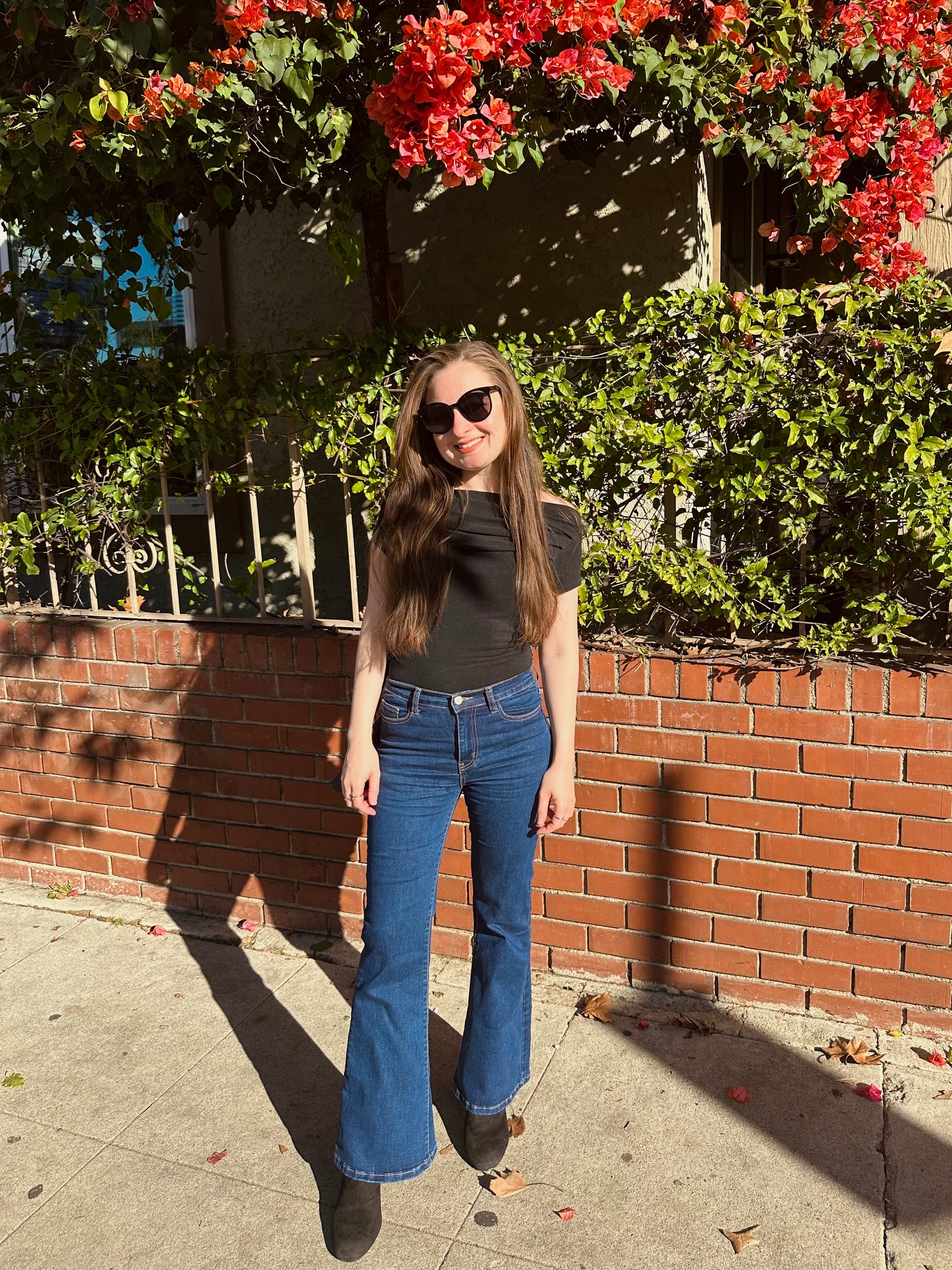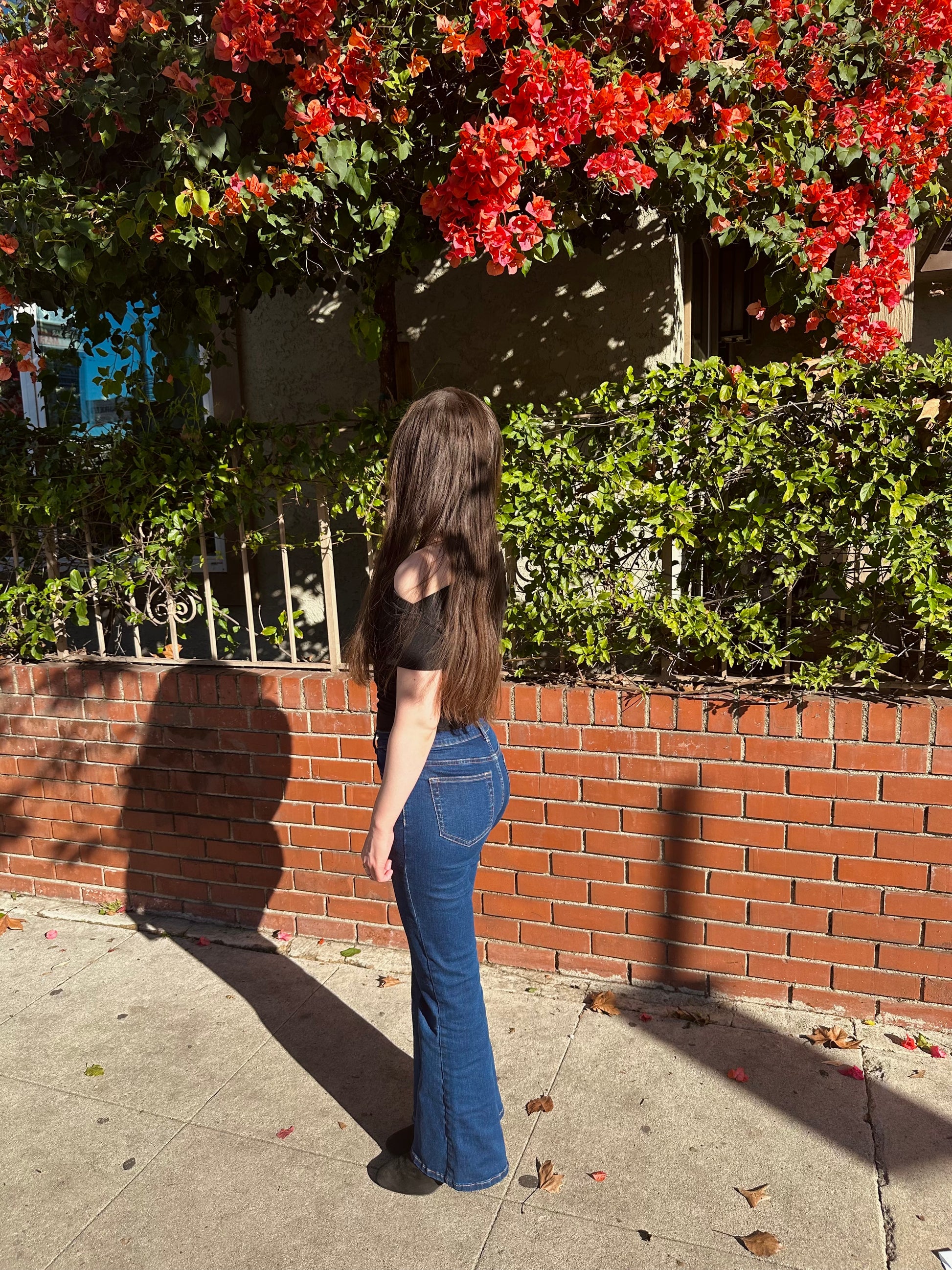 - Features: dark blue wash, button and zipper closure, mid rise, flare jeans
